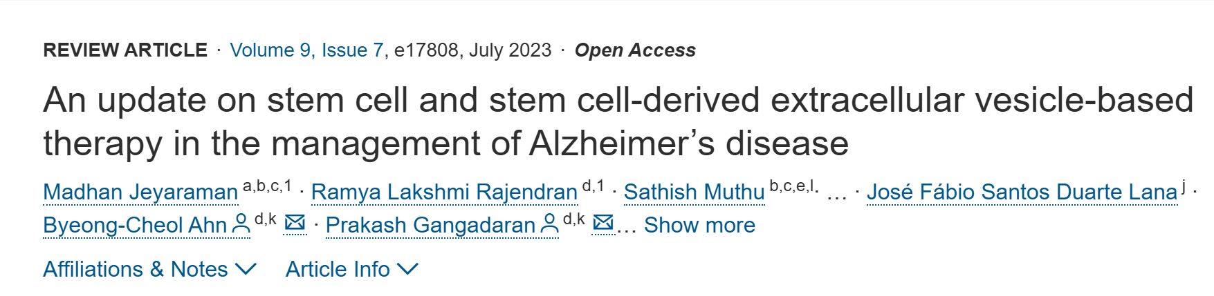 [1]Jeyaraman M, Rajendran RL, Muthu S, Jeyaraman N, Sharma S, Jha SK, Muthukanagaraj P, Hong CM, Furtado da Fonseca L, Santos Duarte Lana JF, Ahn BC, Gangadaran P. An update on stem cell and stem cell-derived extracellular vesicle-based therapy in the management of Alzheimer's disease. Heliyon. 2023 Jun 29;9(7):e17808. doi: 10.1016/j.heliyon.2023.e17808. PMID: 37449130; PMCID: PMC10336689.