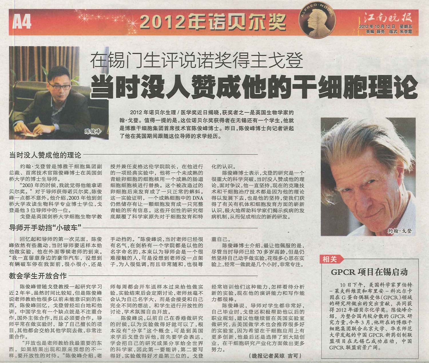 2012年诺贝尔生理/医学奖近日揭晓,获奖者之一是英国生物学家约翰·戈登。值得一提的是,这位诺贝尔奖获得者在无锡还有一个学生,他就是博雅干细胞集团首席技术官陈俊峰博士。昨日,陈俊峰博士向记者讲起了他在英国期间跟随这位导师的求学经历。