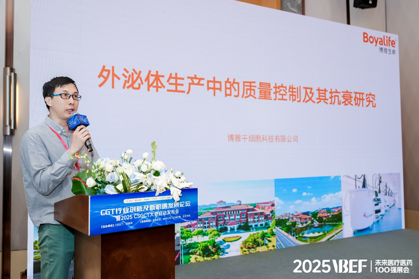 2025年5月9日至10日,2025 VBEF未来医疗医药100强展会在苏州国际博览中心盛大开幕。本次大会聚集了国内外最为活跃的创新企业、成长性企业、龙头企业、医疗机构、金融资本、上下游供应链等,全景呈现年度产业新技术、新产品、新服务、新资源、新商机及新生态。“CGT创投及BD新机遇论坛”作为展会核心论坛之一,聚焦细胞与基因治疗(CGT)领域的研发突破、产业协同与商业化挑战。博雅生命作为CGT领域的代表性企业,受邀出席本次大会,并分享了《外泌体质量体系发展与临床应用》的主题报告,共话CGT产业发展新趋势。同时,在本次大会上,博雅生命旗下干细胞外泌体的最新研究成果受到了与会嘉宾的广泛认可与关注。