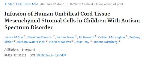 1. Jessica M. Sun, Geraldine Dawson, Lauren Franz, et al. Infusion of human umbilical cord tissue mesenchymal stromal cells in children with autism spectrum disorder. Stem cells journals. 2020 doi: 10.1002/sctm.19-0434
