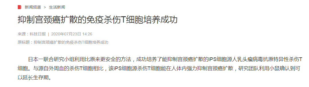 日前,成功培养出抑制宫颈癌扩散的免疫杀伤T细胞受到广泛的关注。这种免疫杀伤T细胞源自于iPS细胞,与外周血的杀伤T细胞相比,这种源自于干细胞技术的免疫杀伤系统T细胞在人体内强有力抑制宫腔癌的扩散。这一研究结果有望为开发针对这种疾病的免疫疗法铺平道路。