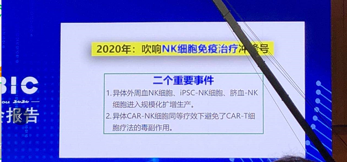 在2020中国生物技术创新大会上,中国科学技术大学教授、中国工程院院士田志刚在主题《合成免疫技术与肿瘤免疫治疗》中表示,2020年吹响了NK细胞免疫治疗的冲锋号:异体外周血NK细胞、iPSC-NK 细胞、脐血-NK细胞进入规模化扩增生产;异体CAR-NK细胞同等疗效下避免了CAR-T细胞疗法的毒副作用。