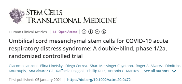[1] Umbilical cord mesenchymal stem cells for COVID‐19 acute respiratory distress syndrome: A double‐blind, phase 1/2a, randomized controlled trial