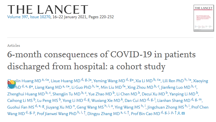 [3] Huang C, Huang L, Wang Y, et al. 6-month consequences of COVID-19 in patients discharged from hospital: a cohort study. Lancet. 2021;397(10270):220-232.