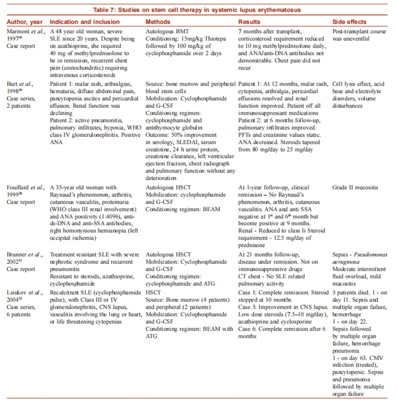 1997年发表了首例自体干细胞治疗系统性红斑狼疮成功的病例报告,随后进行了许多观察性研究和临床试验[表7 ]。