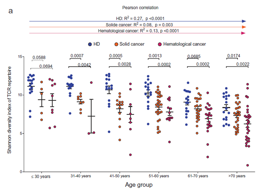 2019年来自德国的马丁路德大学和德国汉堡-埃彭多夫大学研究团队就发现:随着年龄的增加,T细胞的多样性逐渐减少。40岁后,更是呈明显下降趋势。研究团队经过对健康人、实体瘤患者以及血液瘤患者的T细胞分析,结果显示:癌症患者比健康人士的T细胞更少;同时,随着年龄的增长,癌症患者体内T细胞的下降速度,也比健康人更快。
