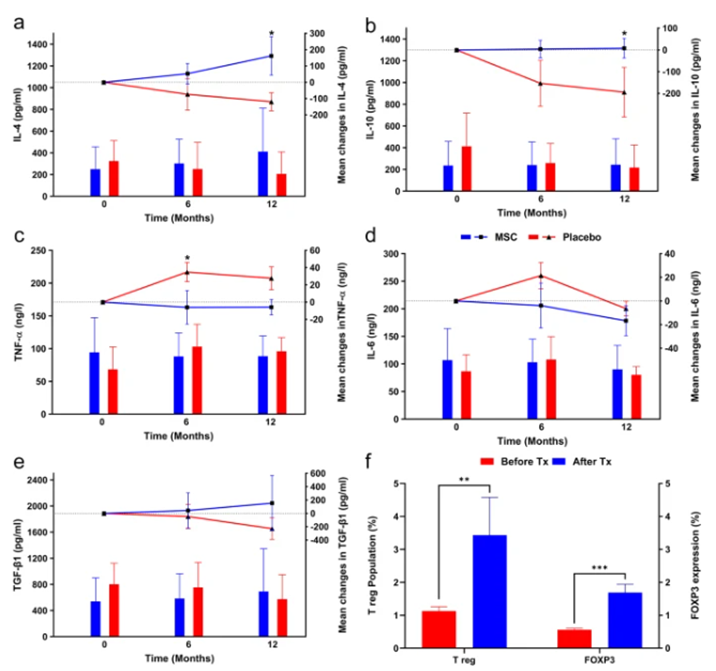 免疫学指标:MSCs组抗炎细胞因子IL-4和IL-10显着增加,这种效果在12个月后持续存在。MSCs组TNF-α水平在6个月后显着降低,并在12个月后显着下降,而IL-6和TGF-β1的变化不显著。此外,在移植MSCs 48小时后发现T细胞水平和FOXP3表达显着增加。