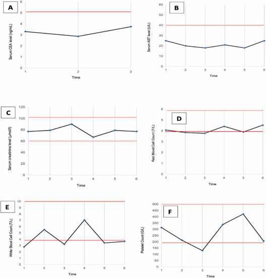 图6。血液生化检查。大多数生化标志物:CEA,AST,肌酐在NK细胞治疗前后维持在正常水平。在治疗期间的某些时候,读取的血细胞,白细胞和血小板略低于正常水平。A、 CEA,B。AST,C。肌酸酐,D。红细胞,E。白细胞,F。血小板。[2]