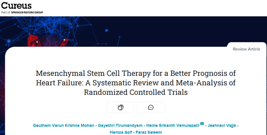 [2] Krishna Mohan G, Tirumandyam G, Vemulapalli H, et al. (August 06, 2023) Mesenchymal Stem Cell Therapy for a Better Prognosis of Heart Failure: A Systematic Review and Meta-Analysis of Randomized Controlled Trials. Cureus 15(8): e43037. doi:10.7759/cureus.43037