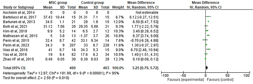 而纳入的11项随机对照试验的汇总分析表明,与对照组相比,MSC干预后,患者LVEF显著增加,经过敏感性分析排除结果异质性后,最终结果保持一致,表明了MSC可以显著改善患者LVEF指标。