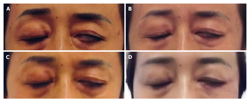 如下图所示,经过UC-MSC移植后,患者的左眼闭合情况迅速改善。在UC-MSC移植之前,患者只能闭上左眼约50%。第一次治疗三个月后,患者能够实现左眼闭合至70%。这种症状继续改善,在第一次治疗后22个月,患者能够完全闭上左眼。(下图ABCD分别表示经过第一次治疗后的第3、7、12、22个月时左眼闭合情况及眼睑位置)
