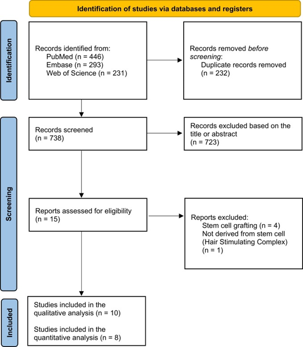 在这项研究中,研究人员获得了10项研究,共有296名患有脱发的受试者参与,大多数研究选择来自脂肪组织的干细胞条件培养基做治疗,也有一部分选择了脐带组织或自体组织中的干细胞。