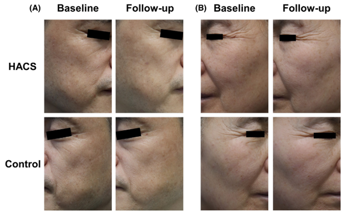 如上图所示,A、B分别为两位患者,Baseline和Follow-up分别为经由干细胞治疗前后的皮肤图像,结果可以明显看出经由干细胞治疗后,治疗组皮肤胶原蛋白和弹性纤维得以沉积,从临床效果上表现为皮肤紧实与皱纹减少。