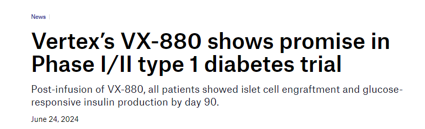 临床使用方式一: 干细胞衍生的全分化胰岛细胞移植 干细胞衍生的全分化胰岛细胞移植是糖尿病治疗的常见方向之一,代表性疗法为Vertex Pharmaceuticals公司开发的干细胞疗法VX-880。 VX-880是近年来备受关注的一款干细胞治疗在研产品,是一种用于治疗1型糖尿病的同种异体干细胞,可分化成胰岛细胞,通过肝门静脉输注后可定居于肝脏,并分泌胰岛素,从而补充1型糖尿病患者胰岛素绝对缺乏的情况。 近日,Vertex Pharmaceuticals宣布了干细胞疗法VX-880的1/2期临床试验的新数据:在接受单次全剂量VX-880输注后的90天内,所有1型糖尿病(T1D)患者都显示出胰岛细胞移植成功,并且能够生成对葡萄糖有反应的胰岛素。在最后一次随访中,12名患者中有11名减少或不再使用外源性胰岛素。