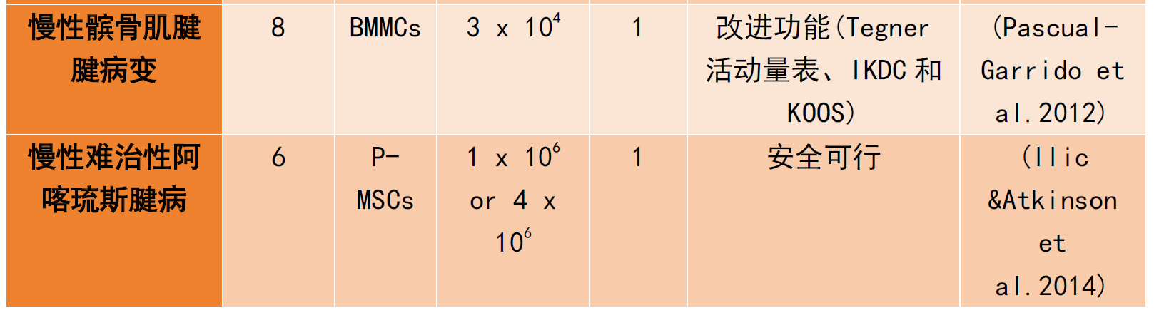 间充质干细胞修复软骨损伤临床汇总 许多研究已经证明了 MSC 疗法对软骨再生的好处及有效性。结合临床案例来看,迄今为止报告的临床研究结果发现,MSC 疗法是安全、可行的,用MSC可以显著改善膝关节炎患者软骨结构与功能、减轻疼痛和促进受损软骨的再生。 下表列出了应用 MSC 治疗软骨损伤的临床研究。 表1引用自文献2 间充质干细胞修复肌腱损伤的临床汇总 肌腱与韧带的细胞组成相似,主要作为肌肉和骨骼之间的附着点,临床研究已证明 MSC 疗法在肌腱修复中的临床潜力。表 2 总结了 MSC 治疗肌腱损伤的临床研究。 表格来自文献2 以上研究表明,MSC在网球肘、肩袖损伤、髌骨肌腱损伤等类型可发挥损伤修复作用,可减轻患者痛苦程度,显著改善损伤部位功能,降低再损伤率。 间充质干细胞修复骨损伤的临床汇总 目前临床治疗骨折的标准医疗程序为制动——复位——固定——功能恢复,尤其是无法在适当时间内愈合的脆性骨折。先前的研究表明,MSC 分泌各种旁分泌因子,如血管内皮生长因子 (VEGF)、骨形态发生蛋白-4 (BMP4) 和骨形态发生蛋白-6 (BMP-6),这些因素增强了血管生成和骨形成【3】。 由此,临床上也不缺乏应用MSC治疗骨折的案例。表 3 列出了应用 MSC 治疗骨损伤的临床研究。 表3引用自文献2 MSC具有成骨分化能力,由此在临床骨科拥有广泛应用。通过以上临床案例可以发现,针对长骨骨折、股骨头坏死等骨科常见疾病,MSC治疗安全有效。 越来越多的临床研究证实间充质干细胞在运动损伤修复中具有巨大的潜力,不过在临床应用仍面临标准化制备、最佳治疗方案确定以及长期安全性和有效性评估等挑战。未来,随着科研的深入,间充质干细胞有望成为运动损伤治疗的主流方式,为运动员和运动爱好者带来更安全、更高效的治疗选择。